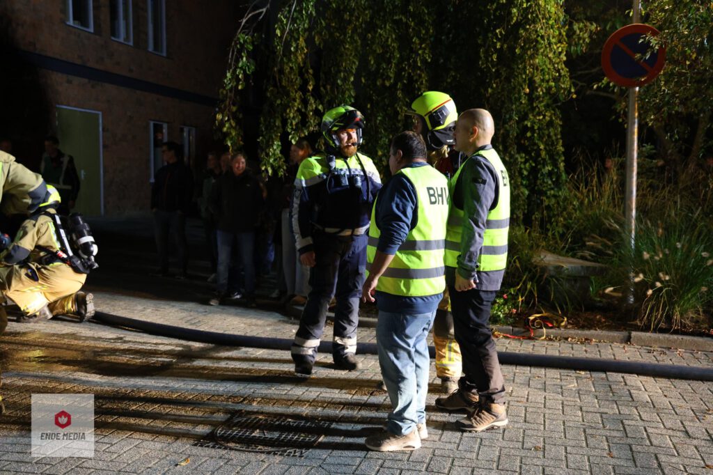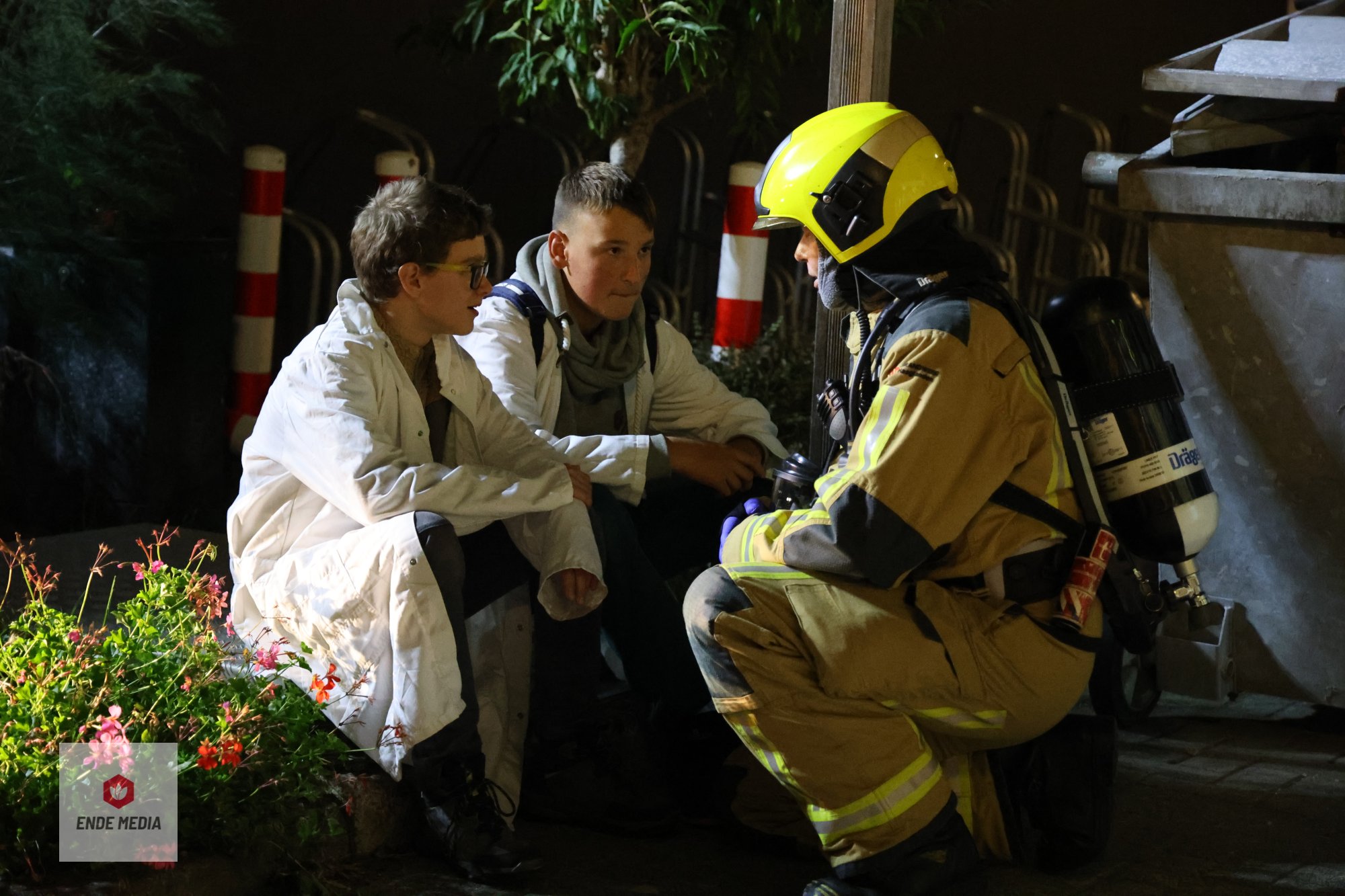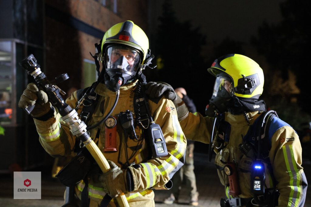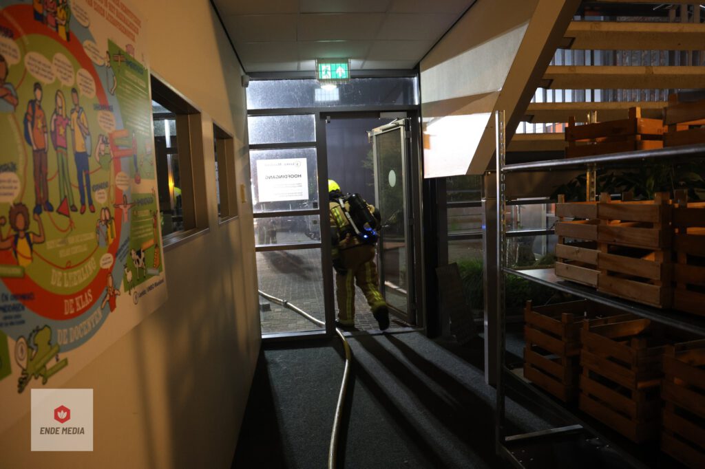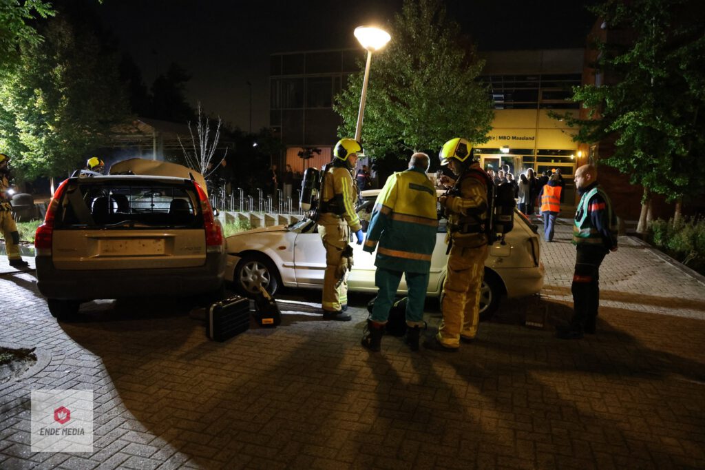 Tegelijkertijd, aan de andere kant van het schoolgebouw, werd een zwaar verkeersongeval nagebootst: een frontale botsing tussen twee voertuigen. Ook hier was de inzet van de brandweer vereist voor hulpverlening en het bevrijden van een slachtoffer uit de autowrakken. Tegen de achtergrond van de brand op de school vatte de motor van een van de voertuigen vlam, wat extra complexiteit aan de situatie toevoegde.