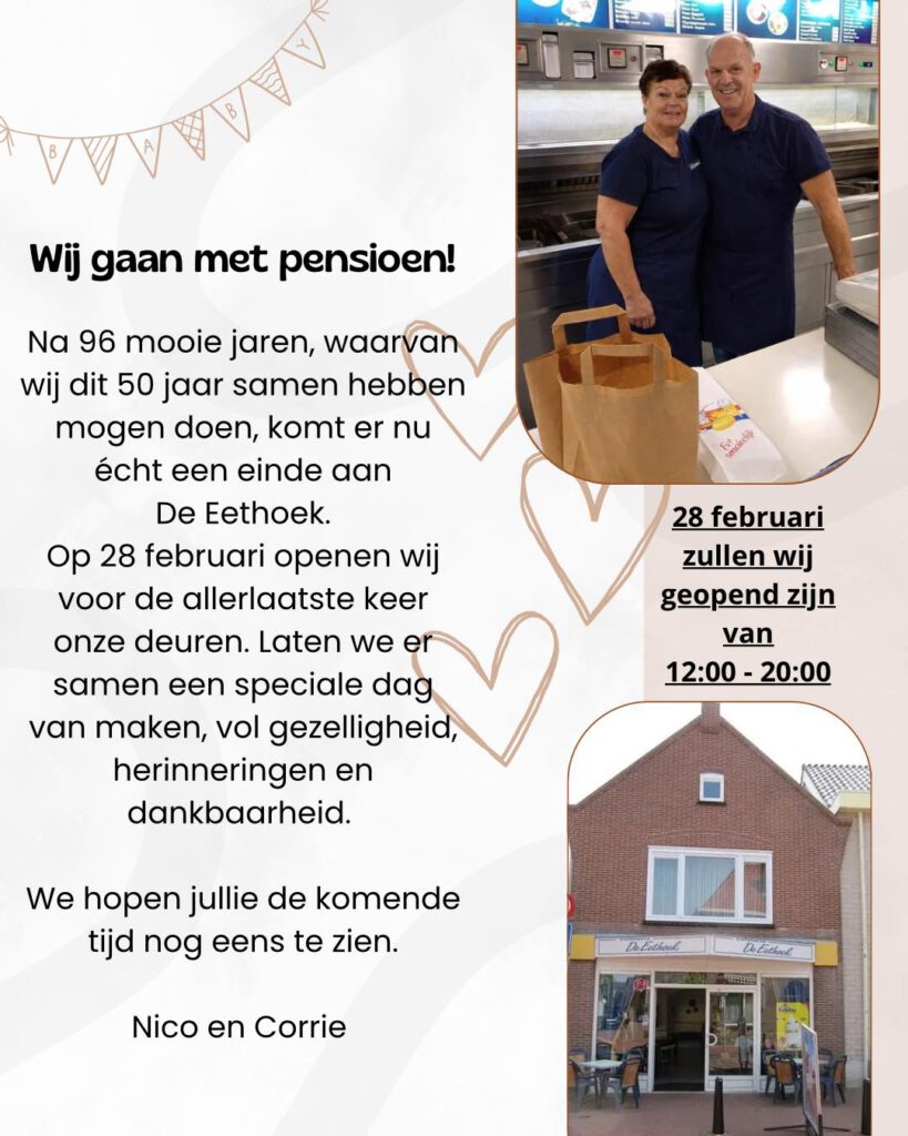 Wie nog één keer de sfeer van De Eethoek wil proeven en Nico en Corrie wil bedanken voor hun jarenlange inzet, moet de agenda erbij pakken. Op zaterdag 28 februari opent de cafetaria voor de allerlaatste keer haar deuren. Tussen 12:00 en 20:00 uur is iedereen welkom om er samen een memorabele afscheidsdag van te maken. Het belooft een dag vol herinneringen, emoties en natuurlijk een laatste bestelling te worden.