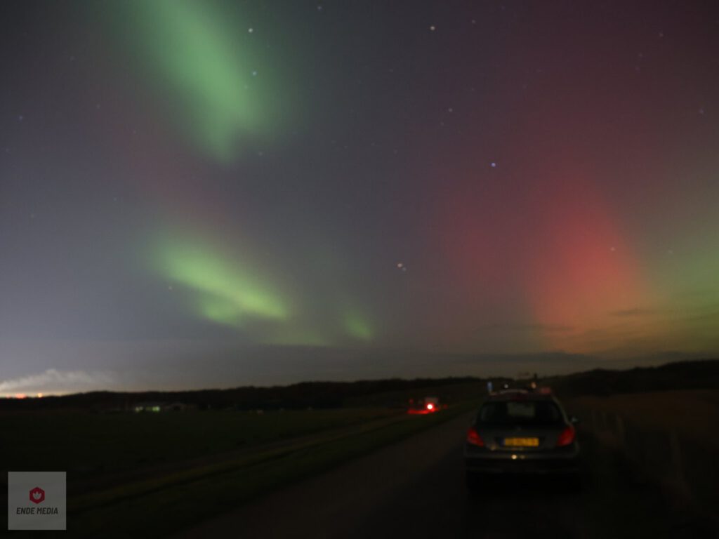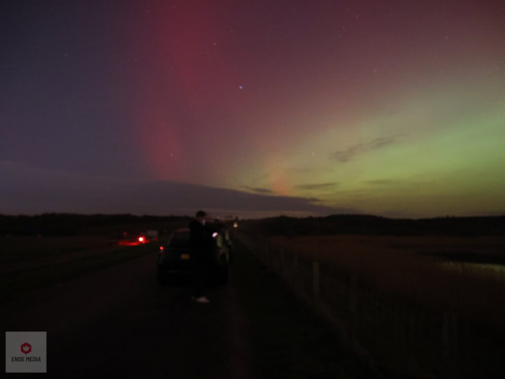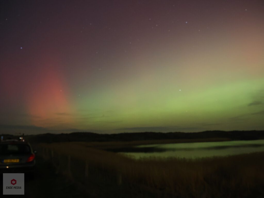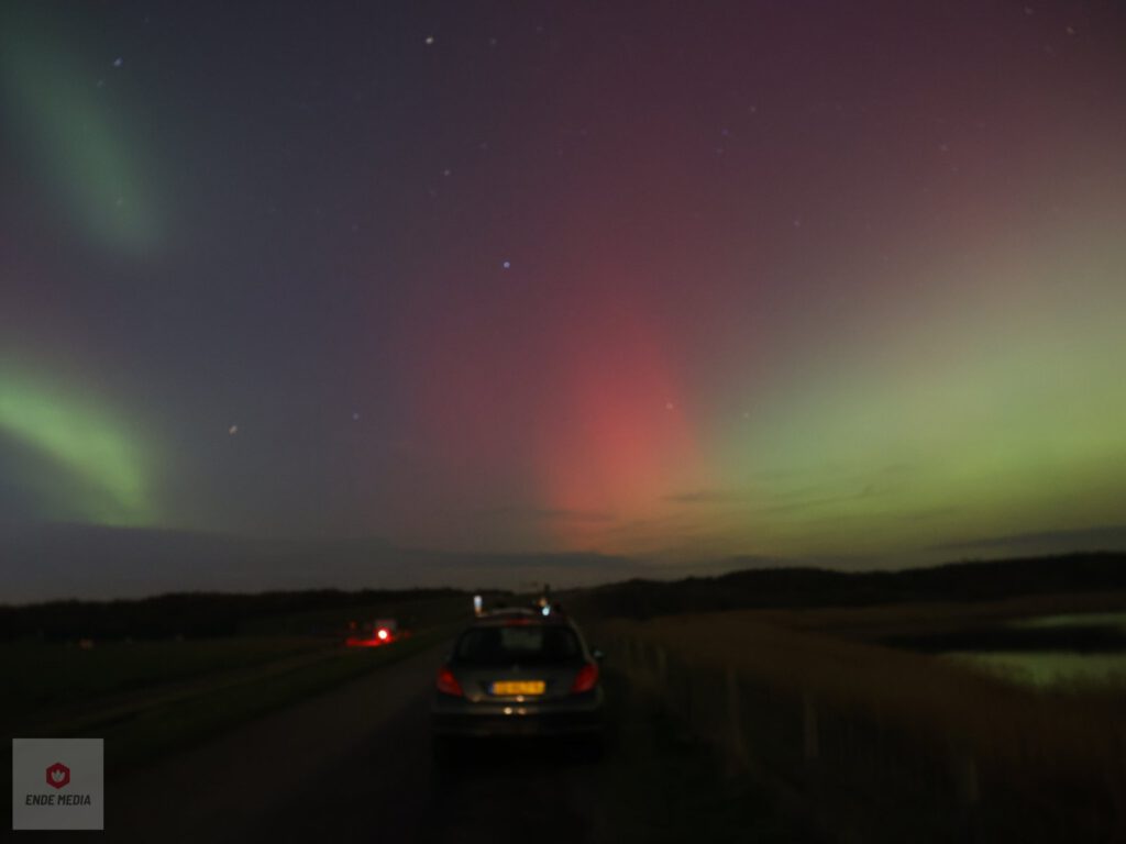 De Strandweg en het nabijgelegen natuurgebied De Banken veranderden maandagavond in een openluchttheater. Een zeldzaam helder noorderlicht zette de hemel in vuur en vlam, wat zorgde voor een toeloop van enthousiaste toeschouwers uit de regio.
