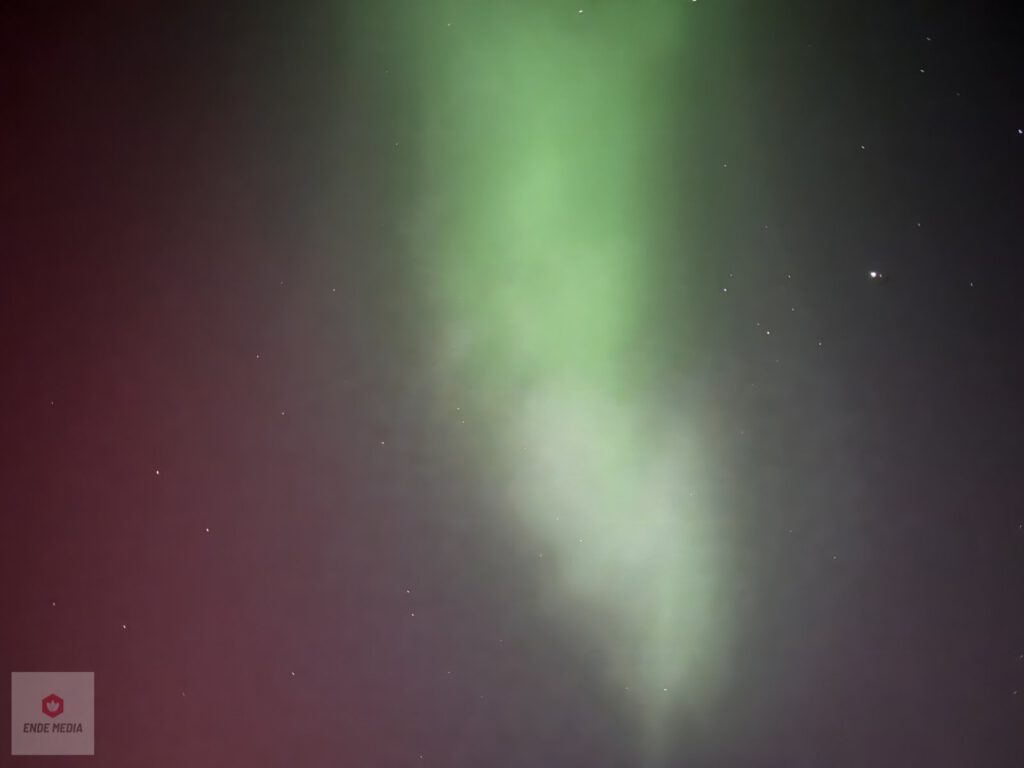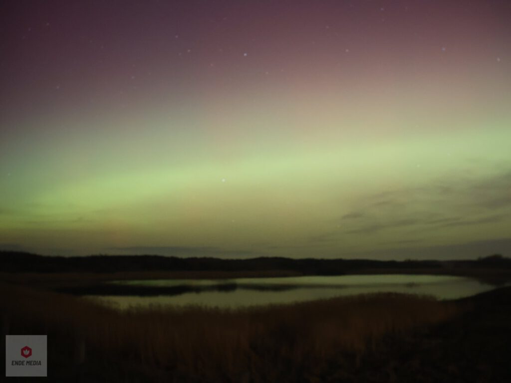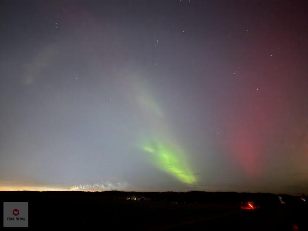 Wie maandagavond toevallig over de duinen keek, werd getrakteerd op een bijzonder palet aan kleuren. Waar de Nederlandse nachtlucht doorgaans donkerblauw of oranje gekleurd is door lichtvervuiling, dansten er nu groene en paarse waaiers boven de zee.